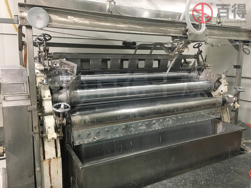 滾筒干燥機(jī)上的預(yù)糊化淀粉是一種高粘稠產(chǎn)品,這種高粘性和稠性可在布料輥和主輥之間導(dǎo)致很大的剪切力。除此之外,產(chǎn)品有很強(qiáng)的粘在滾筒表面的傾向。由于這些特點,滾筒干燥機(jī)的機(jī)械負(fù)荷極高,這就要求滾筒干燥機(jī)的機(jī)械設(shè)計非常堅固,常州百得在設(shè)計和制造這種高強(qiáng)度的滾筒干燥機(jī)上已有多年的經(jīng)驗。