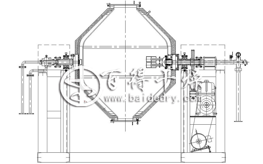 由于罐體內處于真空狀態,各種物料中的溶媒(包括水)在真空的條件下均能在較低的溫度迅速汽化,且罐體的回轉使物料不斷地上下、內外翻動,物料不斷地更新與器壁接觸的表面,從而充分利用了器壁所傳導的熱量,加快了物料的干燥速度,提高干燥效率,并能達到均勻干燥的目的。