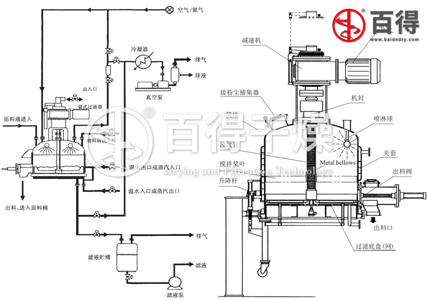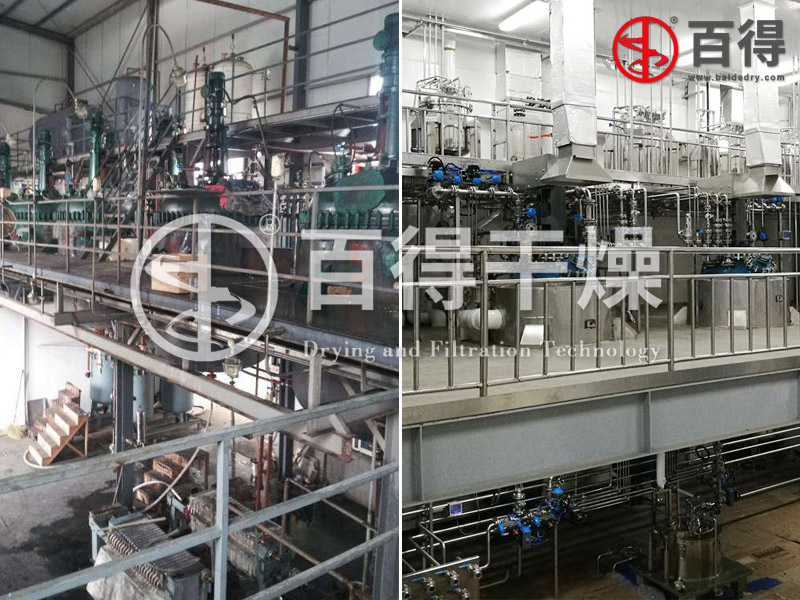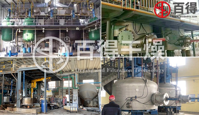 常州百得干燥對精細化工結晶、過濾、洗滌、干燥工藝進行整合,在繼承傳統精髓基礎上,有所突破。從設備改革上入手,對其工藝進行整合,形成新的精細化工精制提純整體工藝設備方案;從簡化工序上入手,把過濾、洗滌、干燥三工序合在一機上完成,減少了工藝轉序的次數;從全流程自動化控制、密閉操作上入手,對其進行改進,使整體工藝更適宜于精細化工工業化大生產的技術要求,配置多臺過濾洗滌干燥機交替間歇使用,可實現連續化工作。