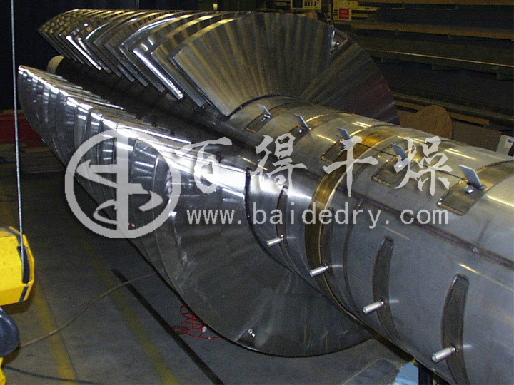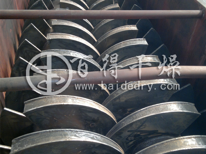 槳葉的排布和各部位尺寸均有一定要求,而且在進料區、干燥區、排料區除槳葉外,另設有輔助機構,以保證整機操作穩定,干燥均勻。此外,停留時間亦可調節。