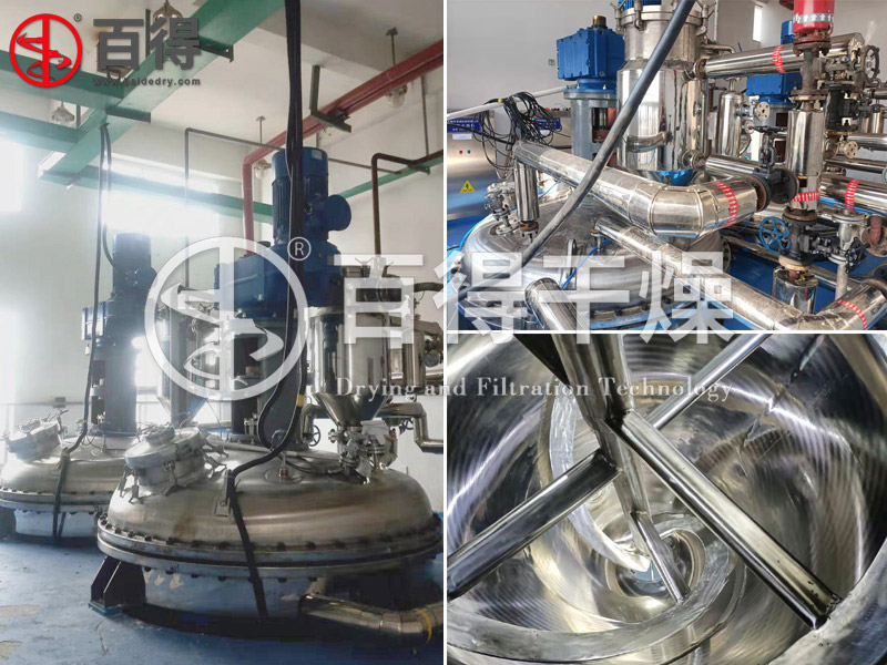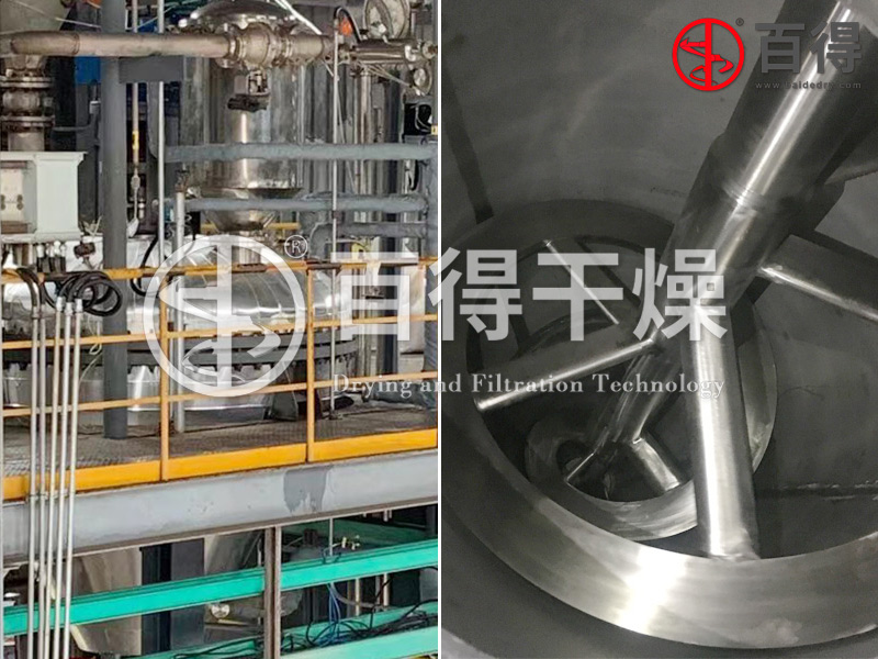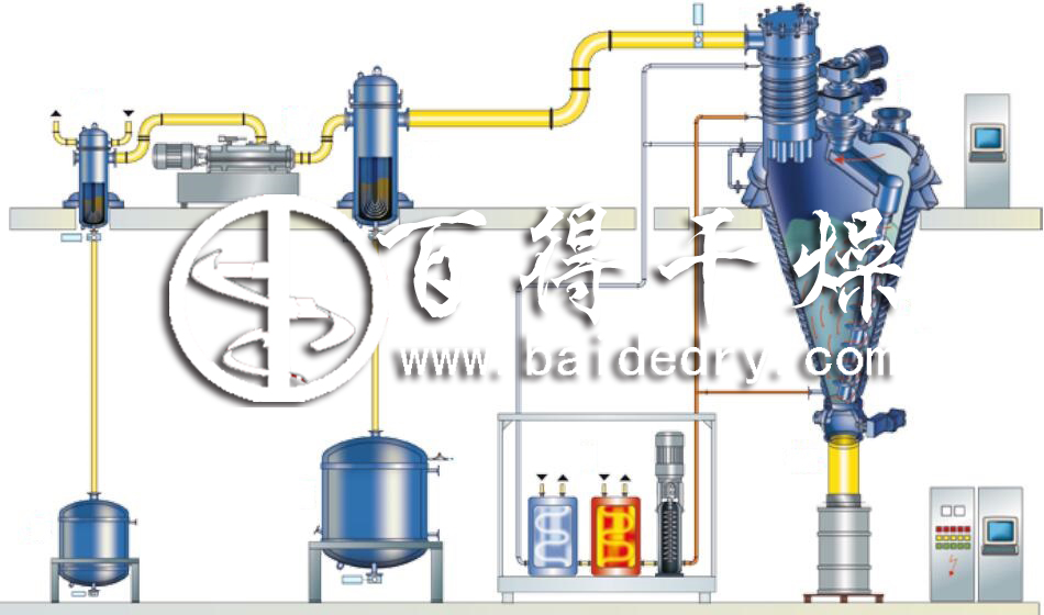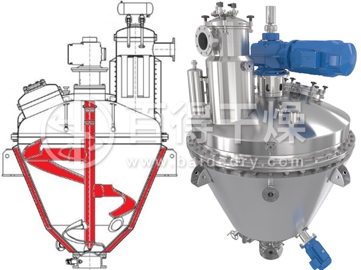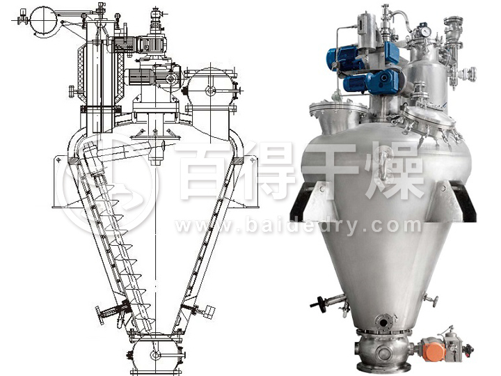 百得干燥開發的真空單錐干燥機是一種集減壓蒸餾、粉碎、混粉、干燥為一體的高效多功能全密閉立式真空干燥設備,全密閉立式真空螺帶干燥機的干燥效率是同等規格雙錐回轉真空干燥機、真空箱式烘3~5倍。真空單錐干燥機結合特殊干燥工藝,能適應粘度大、熱穿透性差,易滾球、易抱團成塊的物料的干燥。