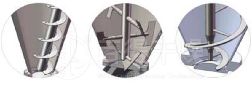 真空單錐干燥機在干燥以及混合工藝過程中沒有使用任何輔助工具,僅僅利用錐形內加熱螺帶的攪拌,這使得物料除了來自攪拌螺旋的提升并不斷地得到剪切和分散,保證了料倉內所有物料都能獲得充分運動,并能使物料除了來自螺旋漿的提升以外,沒有受到任何其它外力的擠壓,避免了粉體與設備以及粉體晶粒之間所產生的無效摩擦,而無效摩擦往往是導致物料晶形破壞的主要因素。這也是真空單錐干燥機干燥能夠在作業過程中得以保持物料晶形完整無損的根本原因。