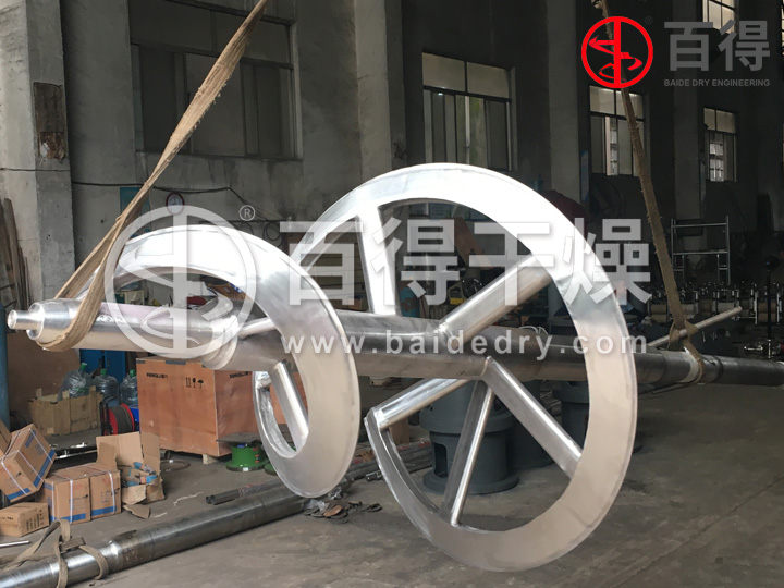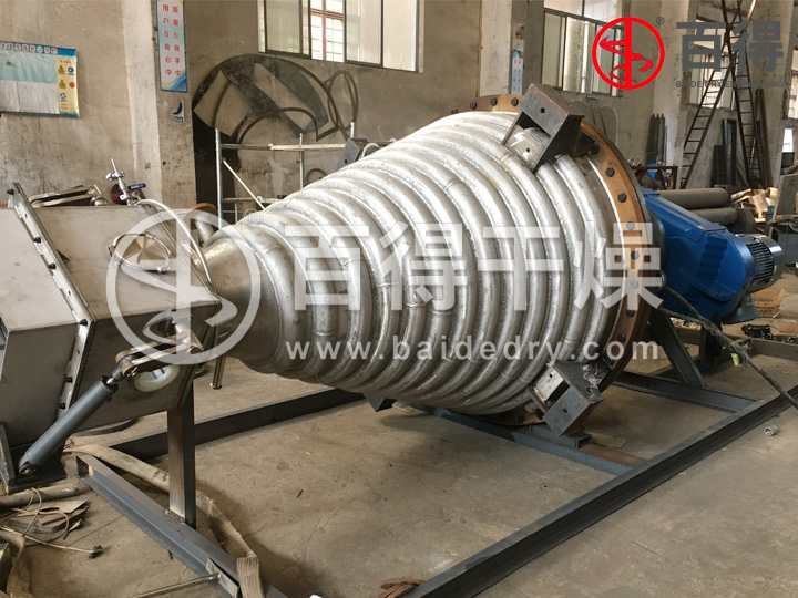 2、攪拌器:空心攪拌軸用支撐桿分別與空心螺帶連接,與空心螺帶連接的上下端用空心支撐桿形成可通過熱媒的回路。為了保證物料不粘結于筒壁,螺帶與筒壁的間隙很小。