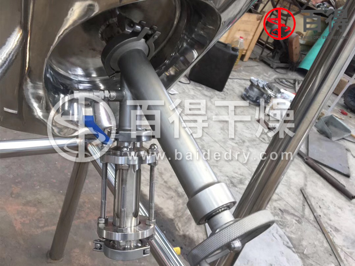 ① 上封頭:承載傳動部分及攪拌器;內表面接管口均圓弧過渡。所有與物料接觸的材質均為316L。工藝管口如下:DN400衛生型人孔、壓力表、防爆視燈、視鏡口、進料口、清洗口、真空口等。