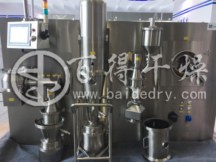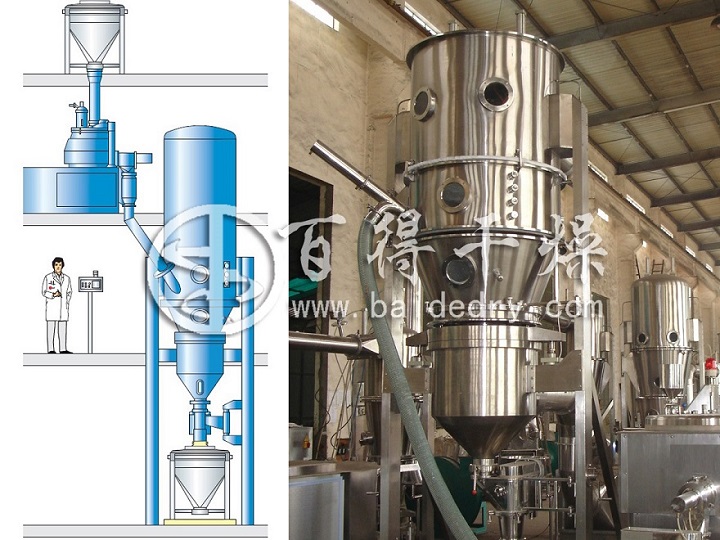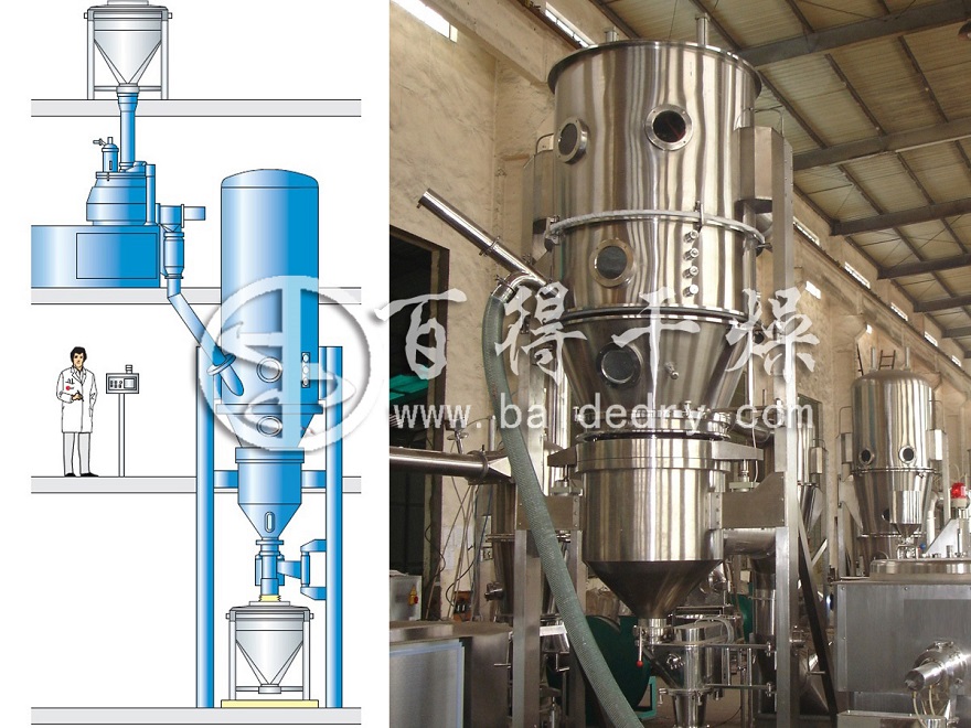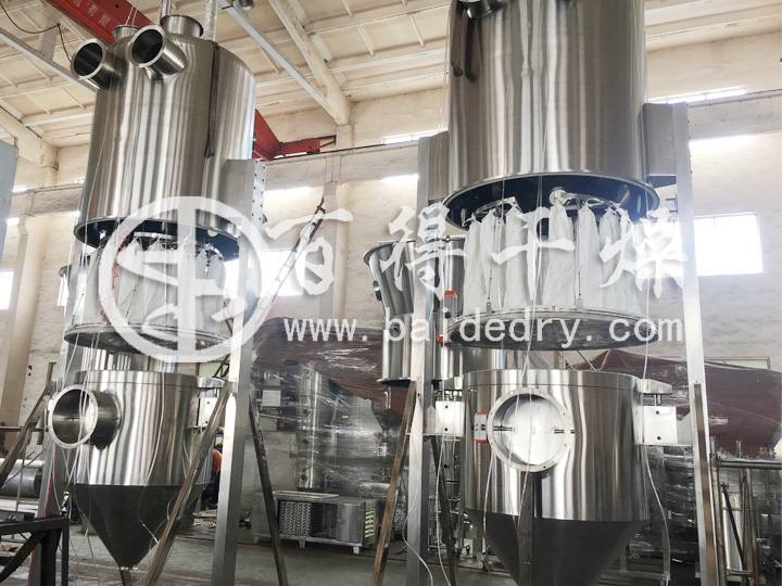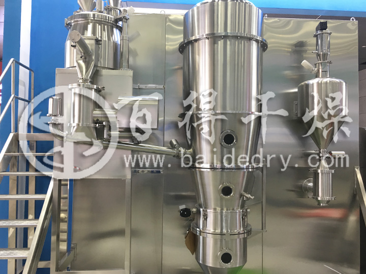 氮?dú)庋h(huán)沸騰干燥機(jī)由空氣過(guò)濾器,空氣加熱器,干燥床,制粒噴槍、分離室,過(guò)濾室,排風(fēng)管、引風(fēng)機(jī)、煙囪、控制系統(tǒng)等組成。