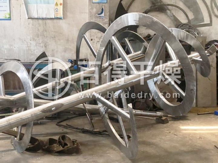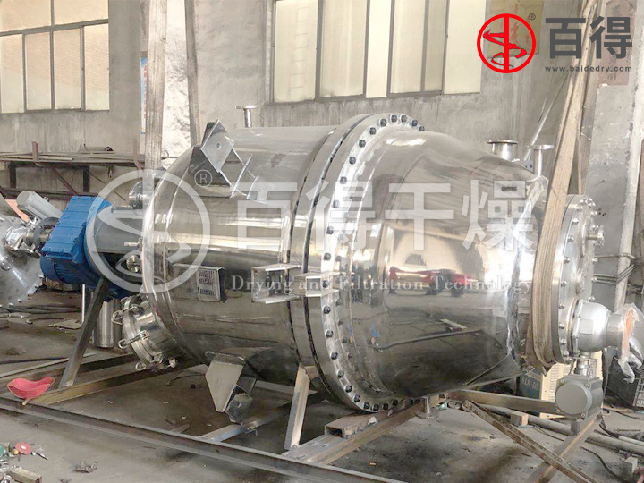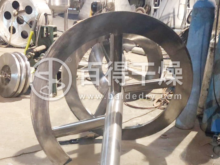 結(jié)晶干燥一體機(jī)采用筒錐式結(jié)構(gòu),在圓筒體和下部錐體上設(shè)置有加熱夾套,可對(duì)物料進(jìn)行加熱或冷卻,在多功能機(jī)內(nèi)部設(shè)置有空心軸和變角度變導(dǎo)程空心螺旋攪拌裝置攪拌,對(duì)物料進(jìn)行攪拌和提升,在出料時(shí)推出物料。在下部錐體內(nèi)設(shè)置有結(jié)構(gòu)較為復(fù)雜的圓錐形過(guò)濾裝置,在設(shè)備底部有特殊設(shè)計(jì)的無(wú)死角快開(kāi)出料裝置或無(wú)死角氣動(dòng)出料球閥。